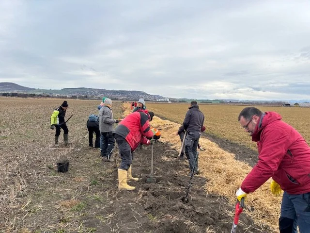 Pour la 6ème année consécutive, un chantier citoyen de plantation de haies était organisé sur la ferme. Cette fois, les arbres et arbustes ont été plantés sur la limite Nord de notre parcellaire, au Nord des parcelles “Carré du Chardon” et “L’écluse”.